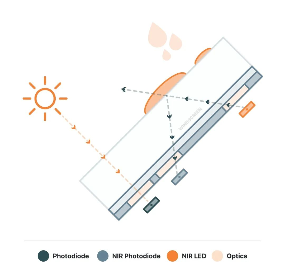 现代雨量和光传感器模块含近红外(NIR) LED,通过一个特殊的光学接口照亮挡风玻璃,就像相机中的镜头。对近红外敏感的光电二极管测量反射光。雨雪产生的信号反射与透明的挡风玻璃不同,因而可检测水分。