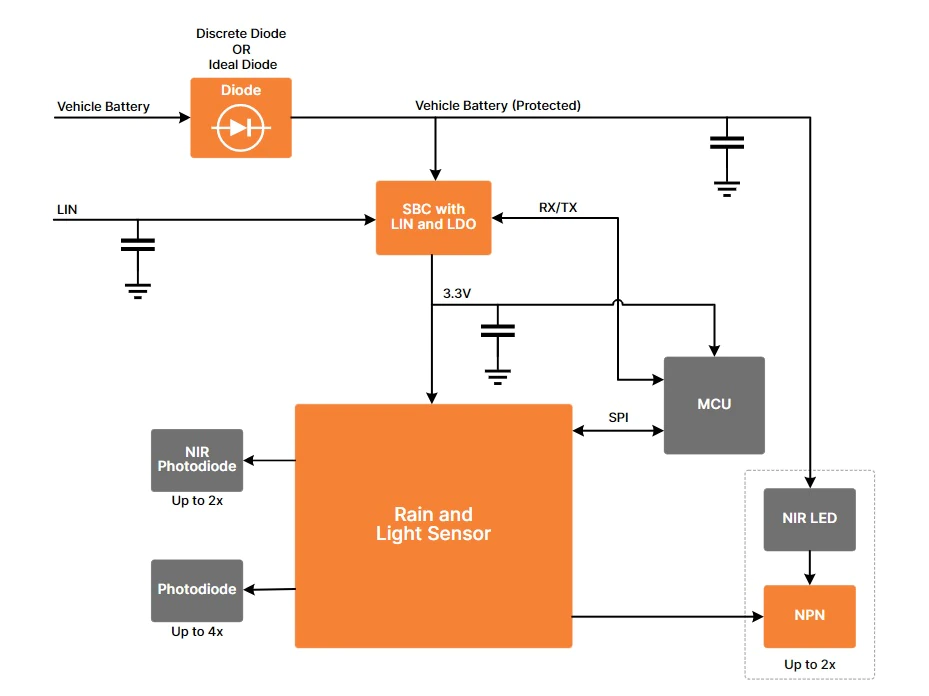 除了雨量和光传感器外,安森美还提供电池保护、系统基础芯片(SBC)和该系统中使用的NPN双极晶体管方案。