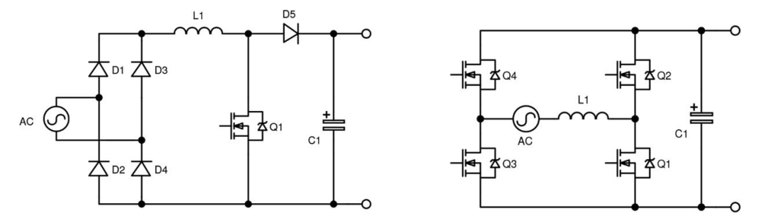 图1:传统(左)和(右)无桥图腾 PFC电路