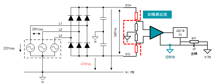 如上图所示,该系统是比较典型的三相输入整流框图,很多客户采用上图的采样方式采集高压母线电压--高阻方式分压+非隔离运放+MCU集成的ADC来实现成本优化的目的。
