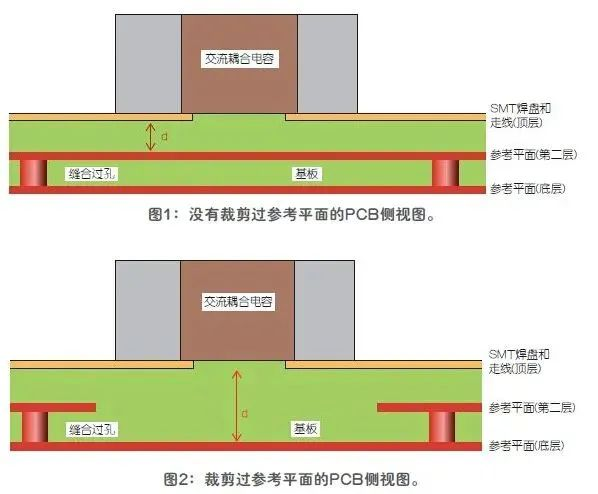 这样可以增加SMT焊盘与其参考平面或返回路径之间的距离,从而减小电容的不连续性。同时应插入微型缝合过孔,用于在原始参考平面和内层新参考铜箔之间提供电气和物理连接,以建立正确的信号返回路径,避免EMI辐射问题。
