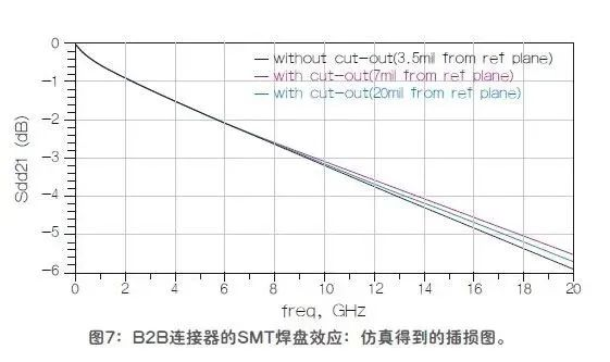 参考平面没有裁剪的SMT设计造成的阻抗失配是12Ω,插损在20GHz时为-6.5dB。一旦对SMT焊盘下方的参考平面区域进行了裁剪(其中“d ”设为10mil),失配阻抗就可以减小到2Ω,20GHz时的插损减小到-3dB。