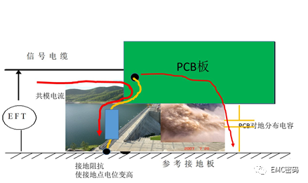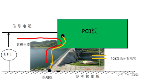 如果接地线存在阻抗(引线较长 或 PCB与壳体通过电容互连),就会使共模电流经过接地线时,PCB板中的接地点电位变高,导致共模电流进一步流入PCB板。这种现象犹如水库中的水位超过堤坝,出现决堤现象,水库中的水进一步向水库的下游流动,这种现象在EMC设计中叫“决堤效应“,图3所示.。