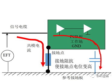 然而就像水库的储水能力永远都是有限的一样,接地线在产品实际设计时,也几乎无法做到零阻抗,于是还是会有共模电流经过接地线点后继续流向PCB板。这就需要PCB板设计与接地的配合,PCB板要能承受得住因接地阻抗而导致继续流向PCB板的共模电流,就像水库的设计与水库下流所能承受的水流能力有关。