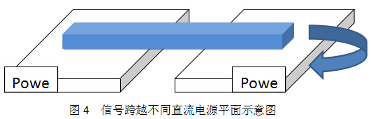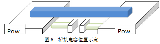 对于穿越两个不同直流电源平面的信号,为了保证他的回流,我们需要采用桥接设计,来实现高频回流。图4为示例。