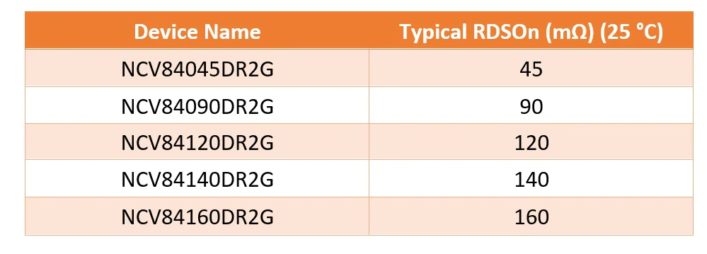 安森美(onsemi)现在提供从 45 mΩ到 160 mΩ的上桥 SmartFET系列 。这些器件是受保护的单通道上桥驱动器,可切换各种负载,如灯泡、螺线管和其他执行器。如表 1 所示,器件名称表示 SmartFET 在 25°C 时的典型 RDSon。下面列出了完整的产品系列: