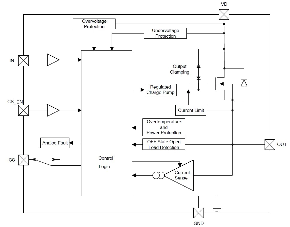 输入 (IN) 引脚是个逻辑电平引脚,用于打开和关断控制逻辑/电荷泵以使 FET工作。电流检测使能 (CS_EN) 引脚启用和禁用电流检测功能。电流检测 (CS) 引脚将一定比例的负载电流检测反馈到微控制器以实时反馈。该引脚是多路复用的;它报告很容易与正常工作区分开来的模拟故障事件,从而使用户能实时检测输出电流或故障情况。电压 (VD) 引脚直接连接到电池或电源,OUT 引脚连接到负载。最后,接地 (GND) 引脚只是器件的 GND。