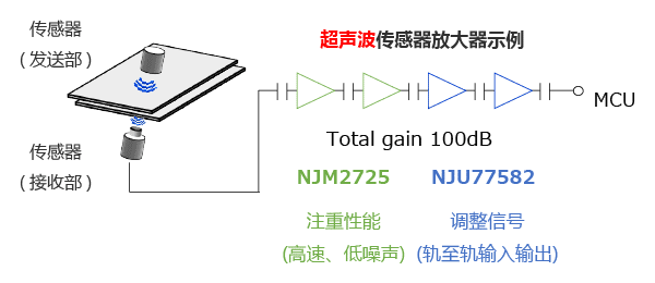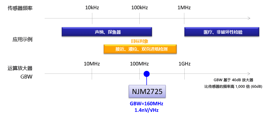 NJM2725 是一款具有 160MHz 高速和 1.4nV/√Hz低噪声特性的运算放大器,该特性是非常适合用于非接触式检测距离和物质状态的超声波传感器的最佳规格。
