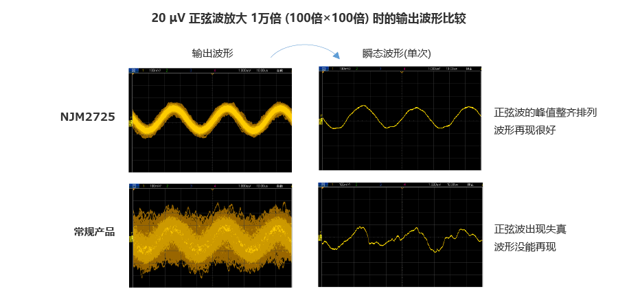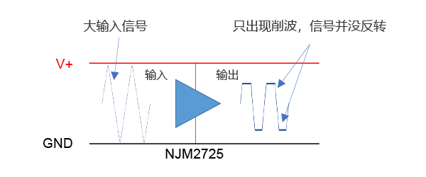 通常,考虑到电池供电系统或用 AD 转换器获取传感器信号时,运算放大器也多使用单电源。 NJM2725 为了寻求最好的高速和低噪声特性,因此在使用单电源时无法处理GND(0V)附近信号。通常,如果将接近GND的信号输入到具有这种特性的运算放大器中,则输出信号可能会反转,这会很难处理。 因此,NJM2725 内置了对策电路,即使输入 GND 或电源附近的信号,也能防止输出反转。这样一来,即使使用单电源,也能放心使用并获得稳定的性能。