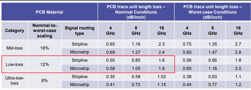 在正常的情况下,Low-loss级别的板材,PCIe Gen4 走线,在表层走线的损耗大于内层的,量化指标值为0.2dB/in,这个值只是用于探讨本文的问题,具体的差值需要PCB实测数值来比较,而且每家板厂的工艺和能力是不同的。