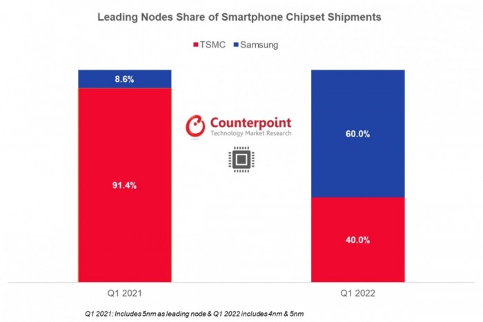 领先的智能手机芯片组节点份额(2021年第一季度与2022年第一季度)
