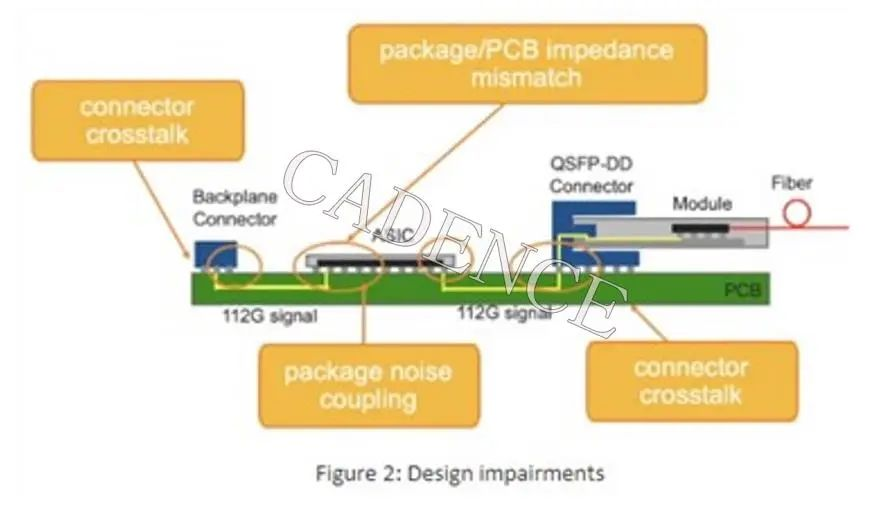 由于系统中的设计缺陷,112G 的部署也面临挑战,如图二所示。SoC 封装,封装到母板阻抗失配,前面板和背板的串扰以及噪声耦合等设计问题均会对误码率(BER)产生显著影响。由于更小的 UI 和更低的 SNR,我们在采用 112G 数据速率的过程中还会遇到更大的挑战。