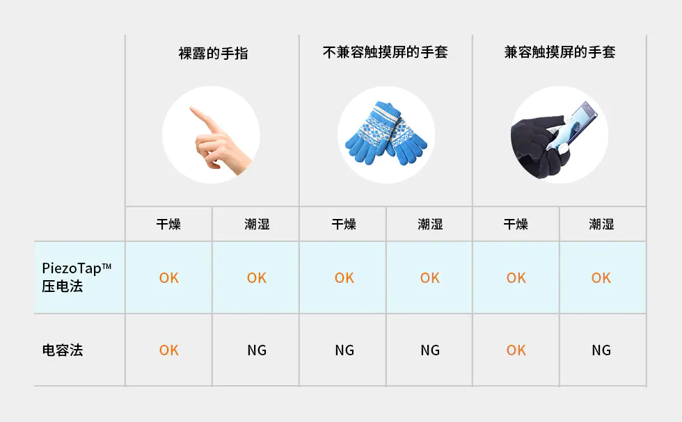 然而,电容式触摸开关存在着一个明显的缺点:易受水和汗水的影响,并且如果需要佩戴手套的话,需要使用专用的导电手套。使用普通手套,手指和感应区域之间的电容变化会变得难以检测,导致无法操控开关。此外,水或汗水还可能导致反应不稳定。由于紧凑型触控开关将会应用于可穿戴设备、户外产品以及可能会接触水的产品,因此亟需解决这类应用的问题。
