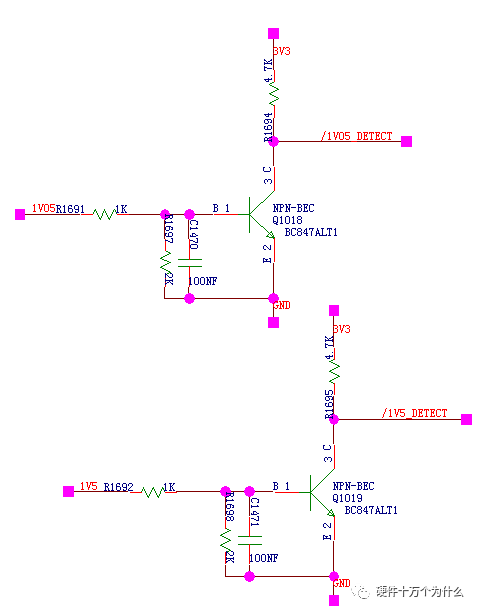 在常温下用一块没有去掉分压电阻的单板正常运行,用示波器测试/1V05_detect管脚,/1V05_detect信号为低电平,把示波器设置为上升沿触发模式,然后用液氮开始对着三极管喷,只有几秒的时间,/1V05_detect信号由低变为高电平了,验证了三极管在低温时,参数发生漂移,Vbe导通门槛变高。
