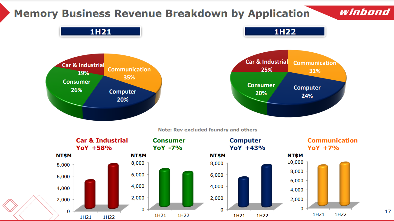 按照不同应用领域划分,涵盖信息娱乐系统、先进驾驶辅助系统与汽车仪表盘的汽车与工业 (Car & Industrial);包括智能电视、机顶盒、可穿戴设备和监控摄像头的消费电子 (Consumer);包括硬盘驱动器、PC外设、打印机的电脑(Computer);以及专注于网络和智能手机业务的通信 (Communication),构成了华邦2022年上半年的四大主要收入来源,占比分别为25%、20%、24%和31%,分布相当均衡。