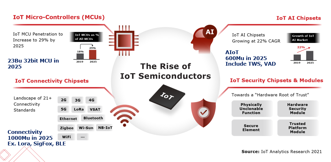 Tetsu Ho援引IoT Analytics Research的最新报告称,物联网半导体市场规模将有望从2020年的330亿美元增长到2025年的800亿美元,复合年增长率高达19%。其中,物联网微控制器 (MCU)、物联网连接芯片组、物联网AI芯片组和物联网安全芯片组和模块,将成为增长最为迅猛的四大领域。