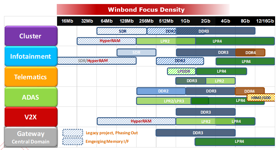 开车通勤也是很常见的物联网应用场景。无论是汽车仪表盘 (cluster)、信息娱乐系统 (infotainment),或是远程信息处理 (telematics)、先进驾驶辅助系统(ADAS),以及车联网 (V2X),华邦都有相对应的内存和接口产品供车厂选择,包括HYPERRAM、SDR、LPDDR、DDR2、DDR3、LPDDR4等,无处不在。