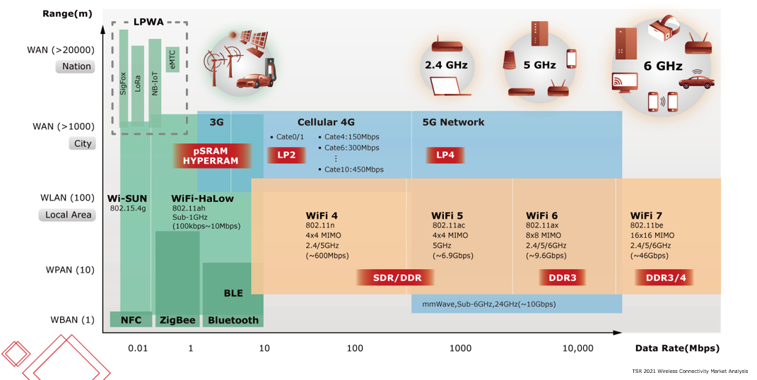 另一块不能被忽视的领域,是以NFC、Zigbee、蓝牙、BLE,甚至Wi-SUN、WiFi-HaLow、LPWA为代表的众多短距离、低速率无线协议,目前华邦在该领域的主打方案是HYPERRAM系列。