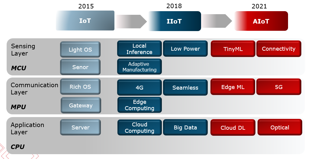 Tetsu Ho用下图为我们展示了CPU/MPU/MCU产品在不同的IoT时代里所呈现的变迁。在早期的物联网时代,主要的数据都来源于各级各类传感器,信息简单,不需要太大的频宽;到了工业物联网 (IIOT) 时代,物联网终端设备开始趋于复杂,一些基本的数据决策和计算需要在本地完成,再加上4G的发展,无缝网络/全覆盖网络 (seamless network) 变得十分重要;进入AIoT时代,与传统印象中“大部分运算会在边缘服务器上或是边缘网关上进行处理”不同的是,相当分量的计算任务被放置于边缘终端上,从而对低延迟、安全隐私、边缘AI、网络连接提出了更高的要求。