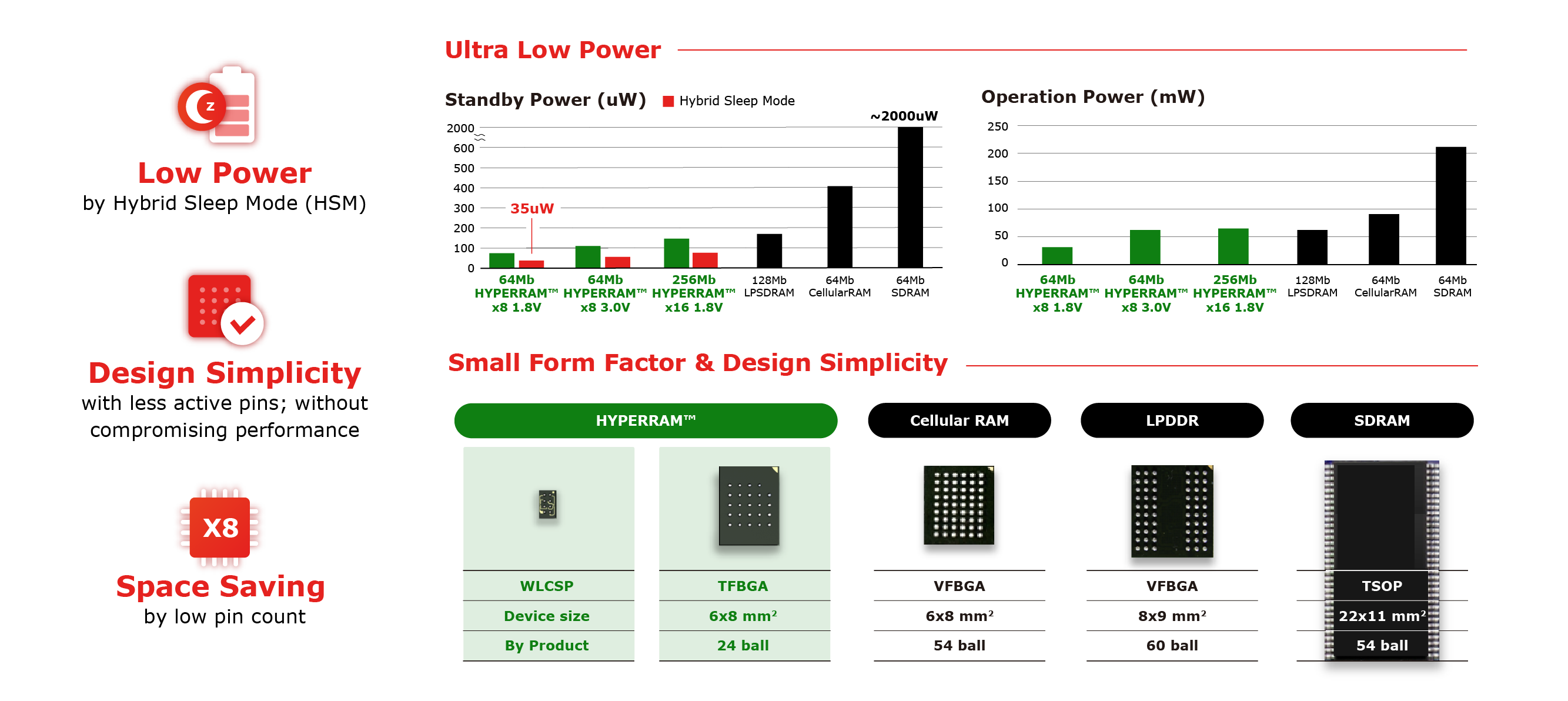 以华邦的64Mb HYPERRAM为例,要知道,HYPERRAM在华邦GP-Boost DRAM产品线中的定位是“超低功耗 (Ultra Low Power, ULP)”,因此,在室温1.8V条件下,其待机功耗为70uW,而相同容量的SDRAM的功耗则是2000Uw (3.3V);更重要的是,HYPERRAM在混合睡眠模式 (HSM,Hybrid Sleep Mode) 下的功耗仅有35Uw (1.8V),与SDRAM在待机模式下的功耗有明显差异。