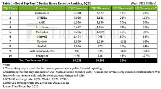根据 TrendForce 集邦咨询分享的最新统计数据,在 2022 年第 2 季度全球十大 IC 设计公司总营收达到 395.6 亿美元,同比增长 32%。增长主要由对数据中心、网络、物联网和高端产品组合的需求推动。 AMD 通过并购实现协同效应。除了攀升至第三位外,该公司还在 2Q22 实现了最高的年收入增长率,达到 70%。