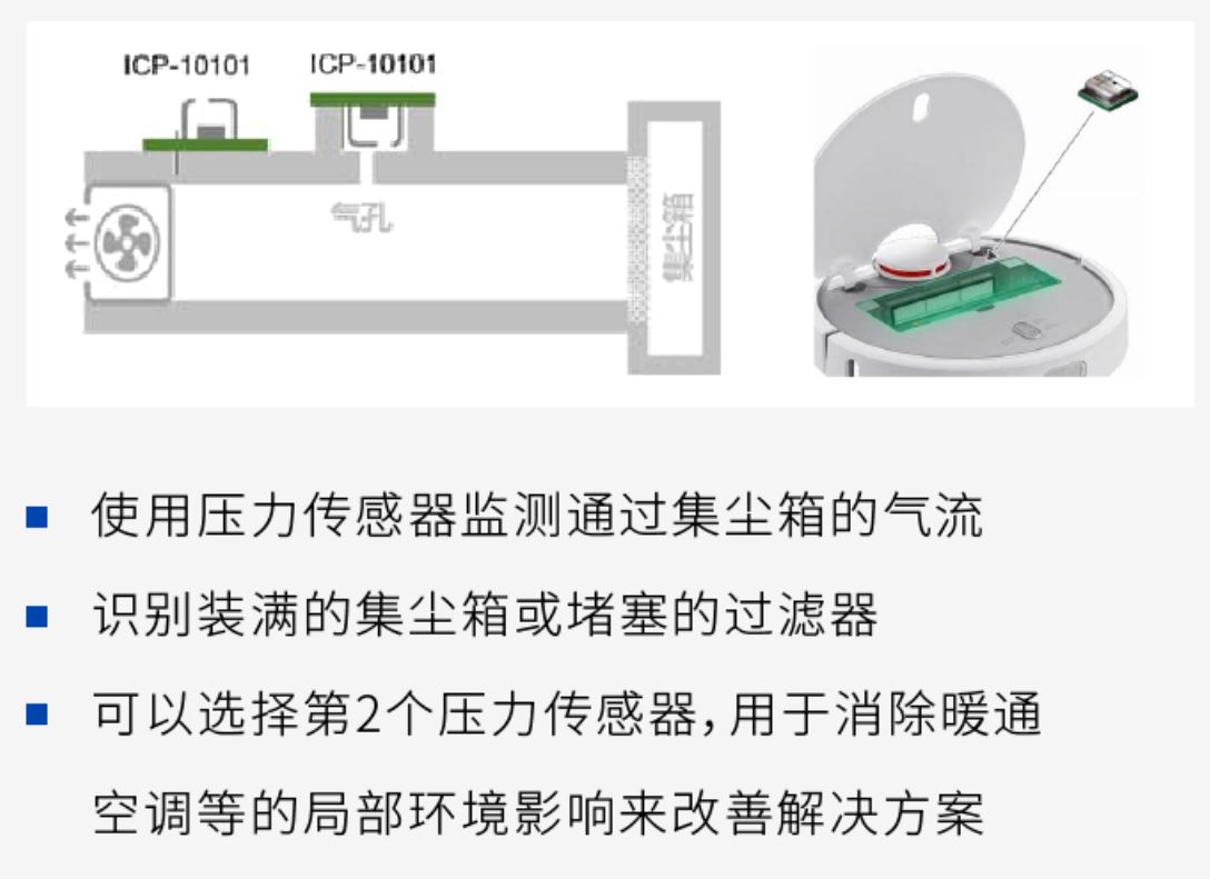 使用压力传感器监测通过尘盒的空气流量,可以估算出尘盒内的垃圾积存情况。TDK的气压传感器ICP-10101适用于此类应用。当检测到尘盒内的气压下降时表明尘盒已满,此时可触发扫地机器人停止工作并返回充电座。一些高端充电座具有自动清扫尘盒功能,尘盒被清理后,扫地机器人便可回到其最后停止工作的位置并继续清扫。